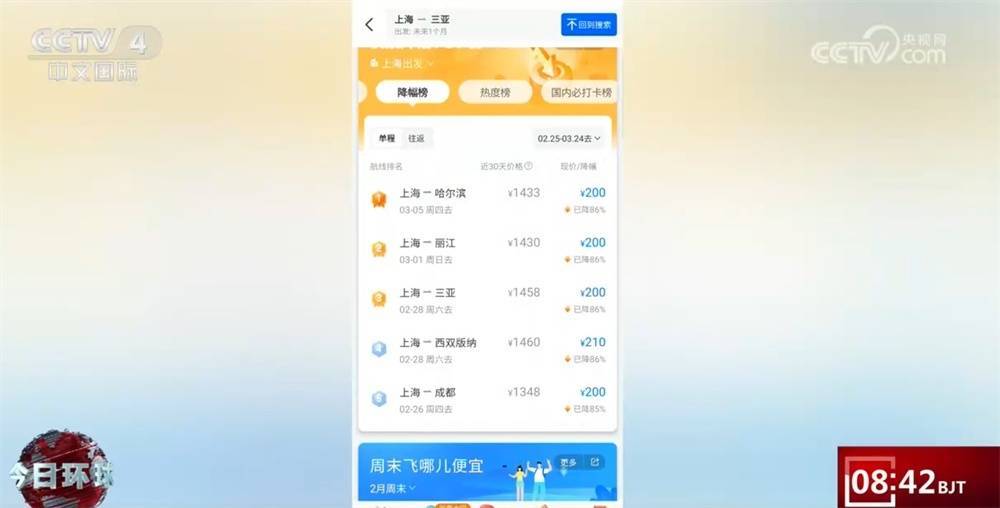 订票平台数据显示,春节假期后,上海至北京、三亚、哈尔滨、西双版纳等多条航线推出折扣机票,单程票价低至200元。北京飞往三亚、广州飞往北京的机票价格均在400元左右。
