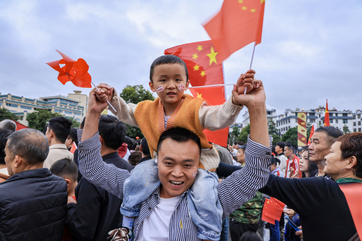 10月1日,在上海中共一大纪念馆,一名小女孩坐在爸爸的肩膀上观看升旗。
