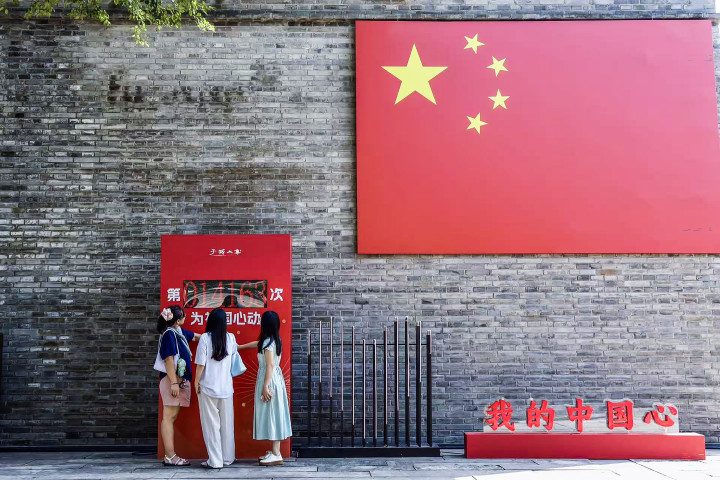 10月1日,在浙江嘉兴市南湖区建设街道子城城墙边,市民参加我为祖国心动打卡活动。